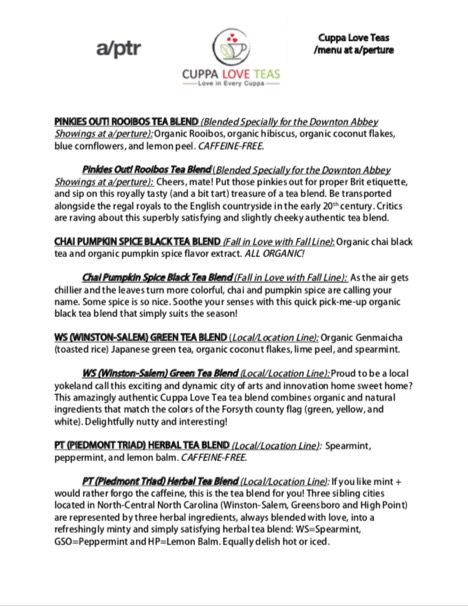 What’s available @ a/perture? Currently, we have 4 Cuppa Love Teas tea blends to choose from, and we hope you’ll try them all. 2 unique tea blends from our Local/Location Line include: WS (Winston-Salem) and PT (Piedmont Triad).