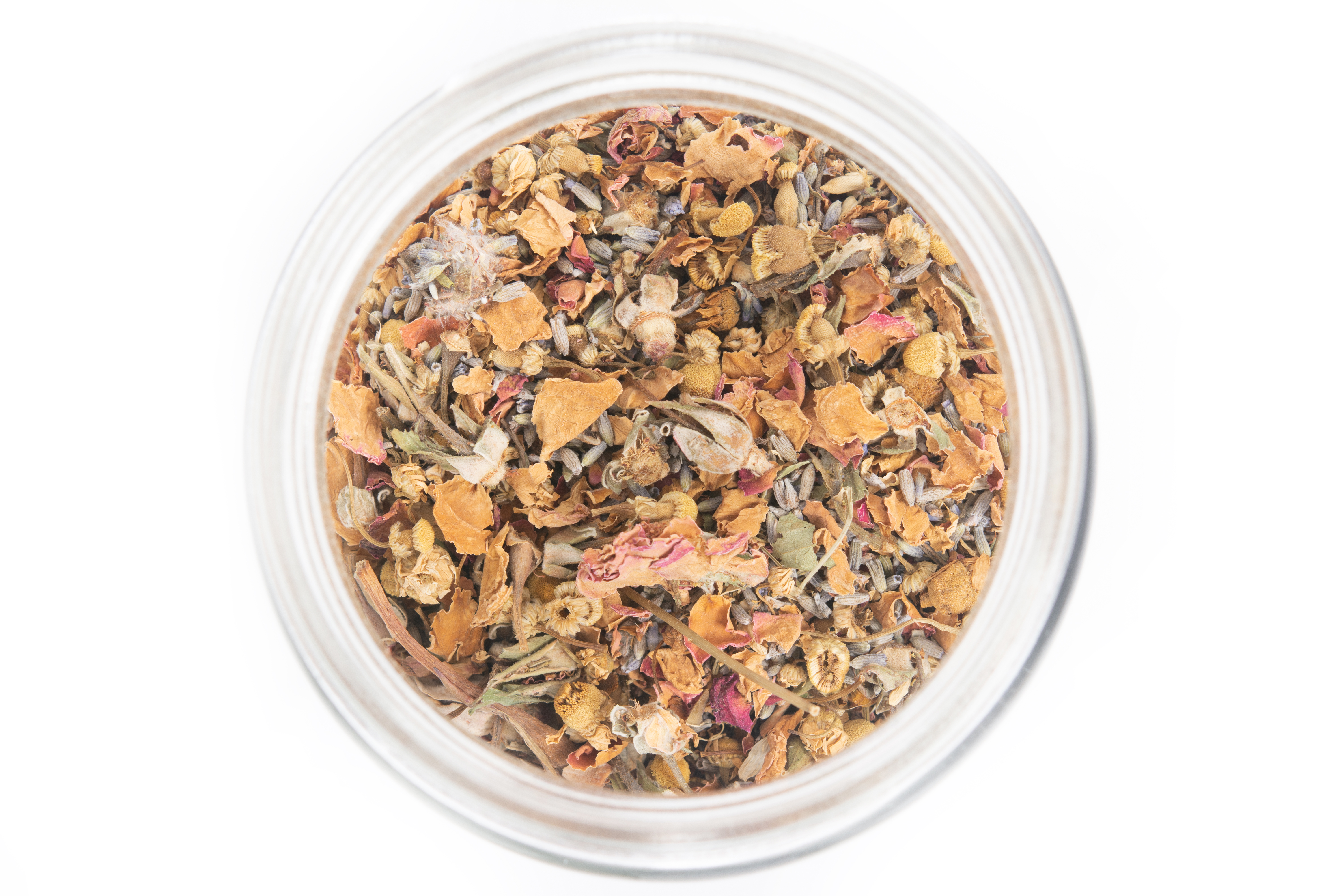 Petals Please PM Herbal Tea Blend: Pink rose buds and petals, organic chamomile, and organic lavender. CAFFEINE-FREE.