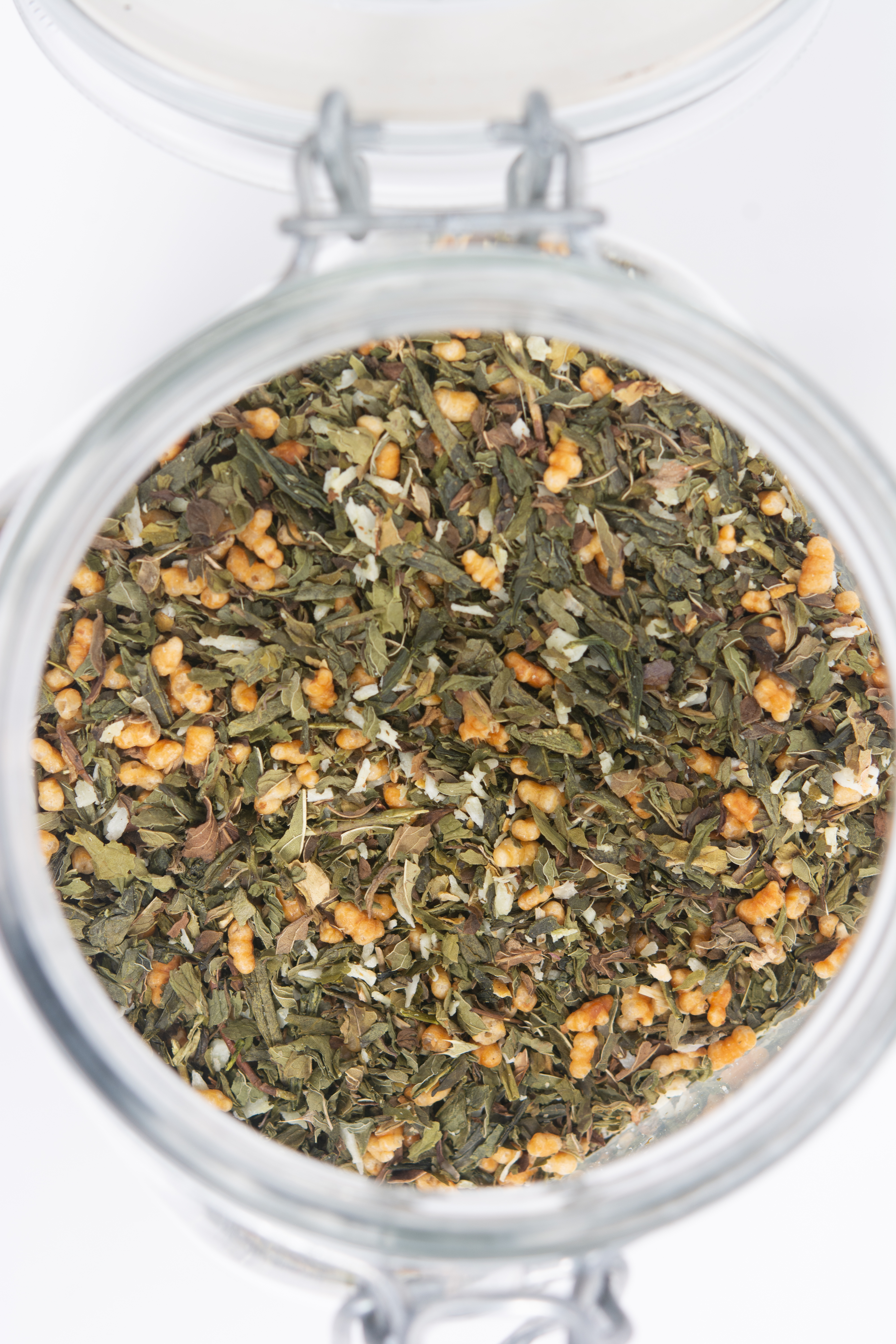 WS (Winston-Salem) Green Tea Blend: Organic Genmaicha green tea, organic coconut flakes, lime peel, and organic spearmint.