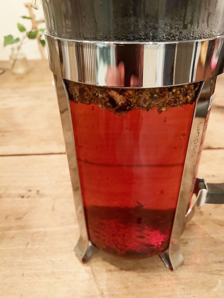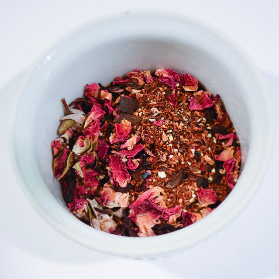 Ingredients: Pink rose petals, orange peel, lemon peel, organic hibiscus, and organic rooibos.