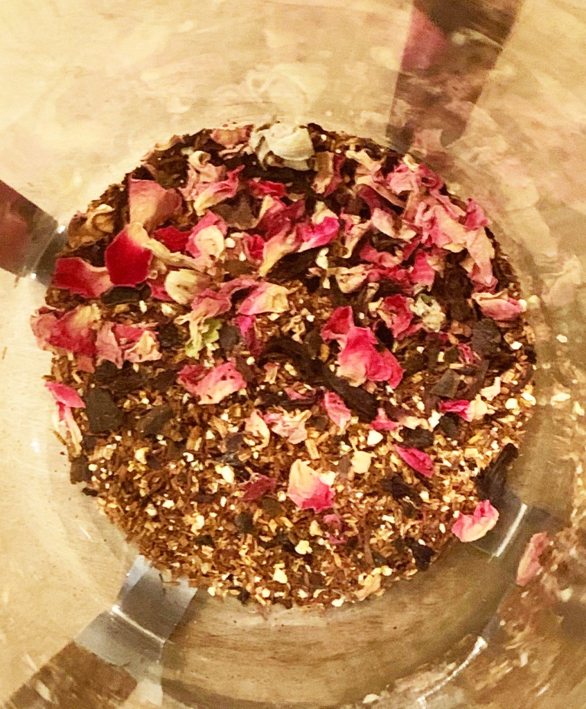 Rose Citrus Hibiscus Rooibos Tea Blend – Fruity, tart, and tangy beautifully rosey-hued tea blend that steeps to the color of a glorious sunset. Share, sip, and savor it as you watch that golden globe of sun set for the evening on the horizon and fade harmoniously into a sky full of colors, like a beautiful painting.