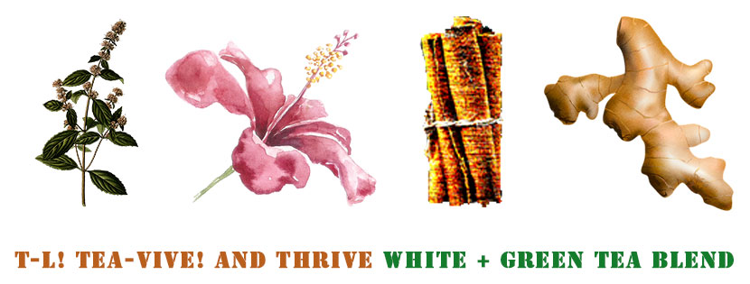 T-L! TEA-VIVE! & THRIVE INGREDIENTS: ALL ORGANIC WHITE PEONY WHITE TEA, SENCHA GREEN TEA, HIBISCUS, GINGER, CINNAMON, AND PEPPERMINT.