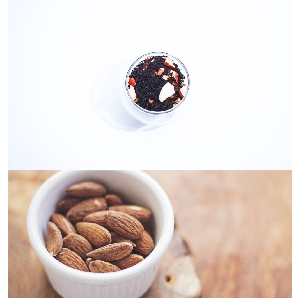 *Amaretto/Almond Black Tea Blend: If you’re nuts about nutty flavors and a fan of amaretto and almond, this is the ideal gourmet, dessert-like tea for you! Nice ‘n nutty with real chopped almonds. Also, makes a yummy tea latte, with the addition of amaretto/almond simple syrup for those who like a sweet treat. Also, try a dash or two of ground cinnamon. A perfect pairing would be with an almond biscotti.