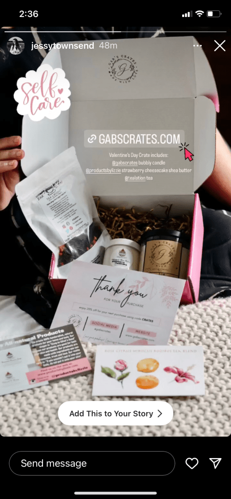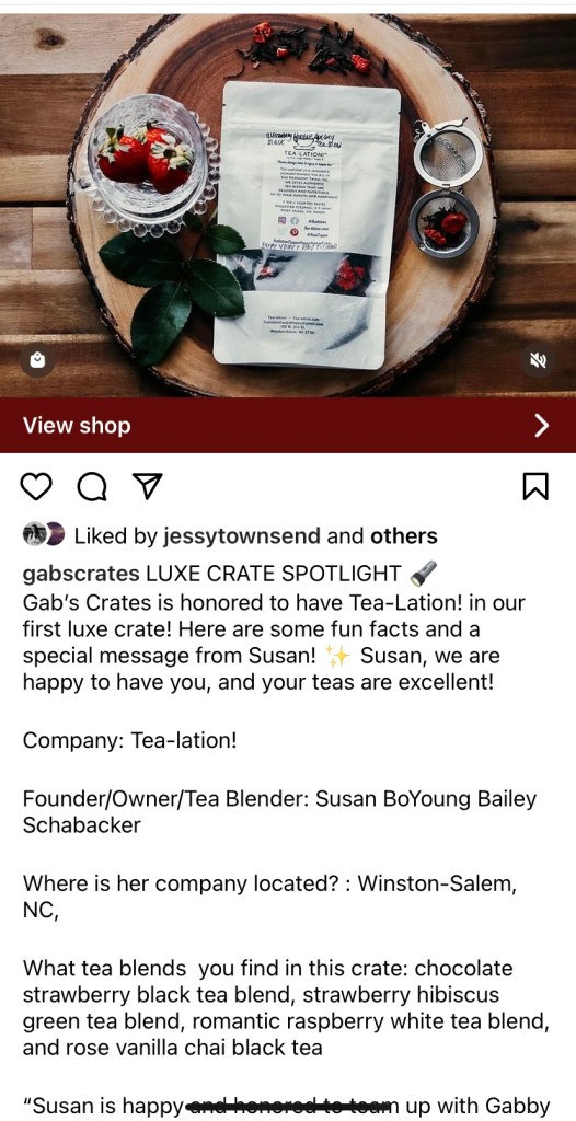 Super happy and honored to make friends with and team up with fellow, local WS, NC minority and woman business owner of Gab’s Crates. Gabby, also a full time mother, has been busy packing crates, promoting TL! Vday Teas, scrumptiously scented strawberry cheesecake shea butter by Cristen, of Lizzie’s All Natural Products and her also heavently scented aromatic candles for absolute ambiance this Valentine’s. Connect with Gabby (@GabsCrates), Cristen (@ProductsbyLizzie), and me (@Tealation and @SusanBBSchabacker) on FB and IG and order a crate of our heartfully combined artisanal handcrafted products!